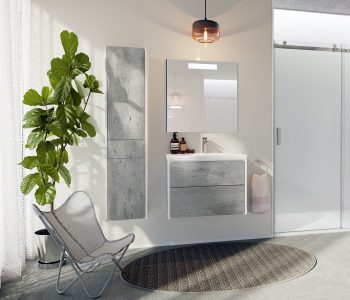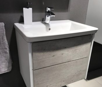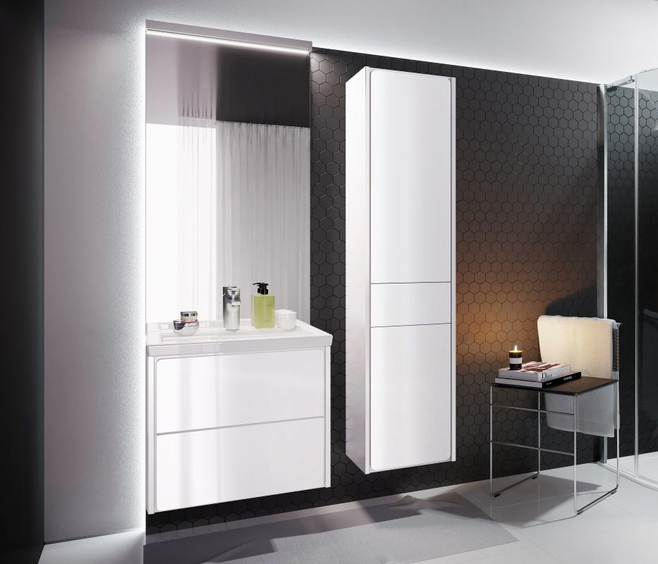 Meble Ronda dostępne są w dwóch kompozycjach: pierwsza stanowi fronty imitujące beton z korpusami w bieli, druga to połączenie bieli w macie i połysku. Obie propozycje są w trendach, ale też są uniwersalne i nadają się do wielu przestrzeni. Umywalka jest pojemna, a płaskie brzegi pełnią funkcję półki na mydło.