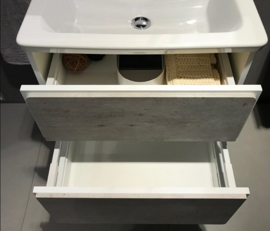 Można wybrać 3 szerokości mebli w zależności od wielkości łazienki: 60, 70 i 80 cm. Meble są bardzo praktyczne, mają dwie szuflady, z czego górna wyposażona jest w syfon oszczędzający miejsce, co zwiększa przestrzeń do przechowywania. Wygodne szuflady mają ekskluzywną funkcję i posiadają komfortowy system cichego domykania “PUSH OPEN”. Dno szuflad dodatkowo pokryte jest elegancką matą.